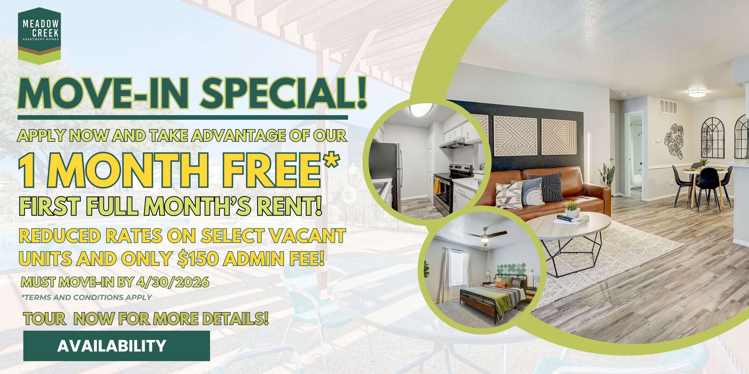 It’s time to live your best life! Discover the Meadow Creek difference—featuring spacious 1, 2, or 3-bedroom floor plans, upscale hardwood floors, new appliances, ceiling fans, and walk-in closets. Enjoy your own private balcony or patio. Exclusive community amenities include our rejuvenating pool, beautiful clubhouse complete with a pool table, a business center, and an outdoor grill area perfect for socializing with friends. Our pet-friendly policy means your fur babies are welcome too!